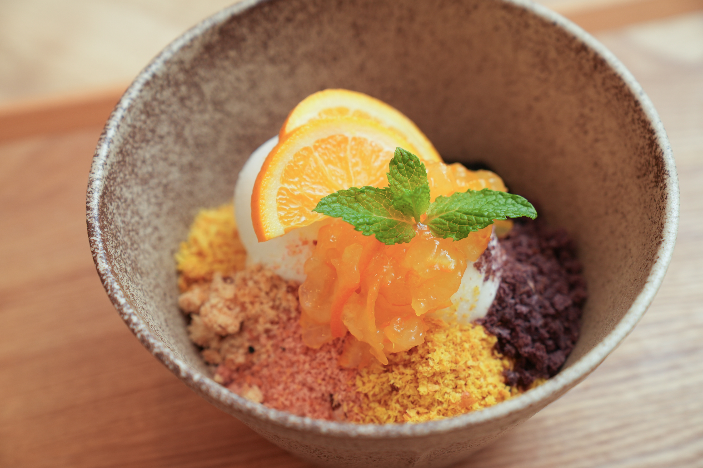 あっと驚く「パンのかき氷」は、余ったパンの再生を考え抜いた作田さんのひらめきから生まれたモノ。かぼちゃやビーツ、炭が練り込まれたパンをそれぞれパン粉に加工し凍らせ氷に見立て、アイスクリームやフルーツといただきます。そのサクサク感とパンの甘味は氷以上に味わい深く、お腹も満たされます。