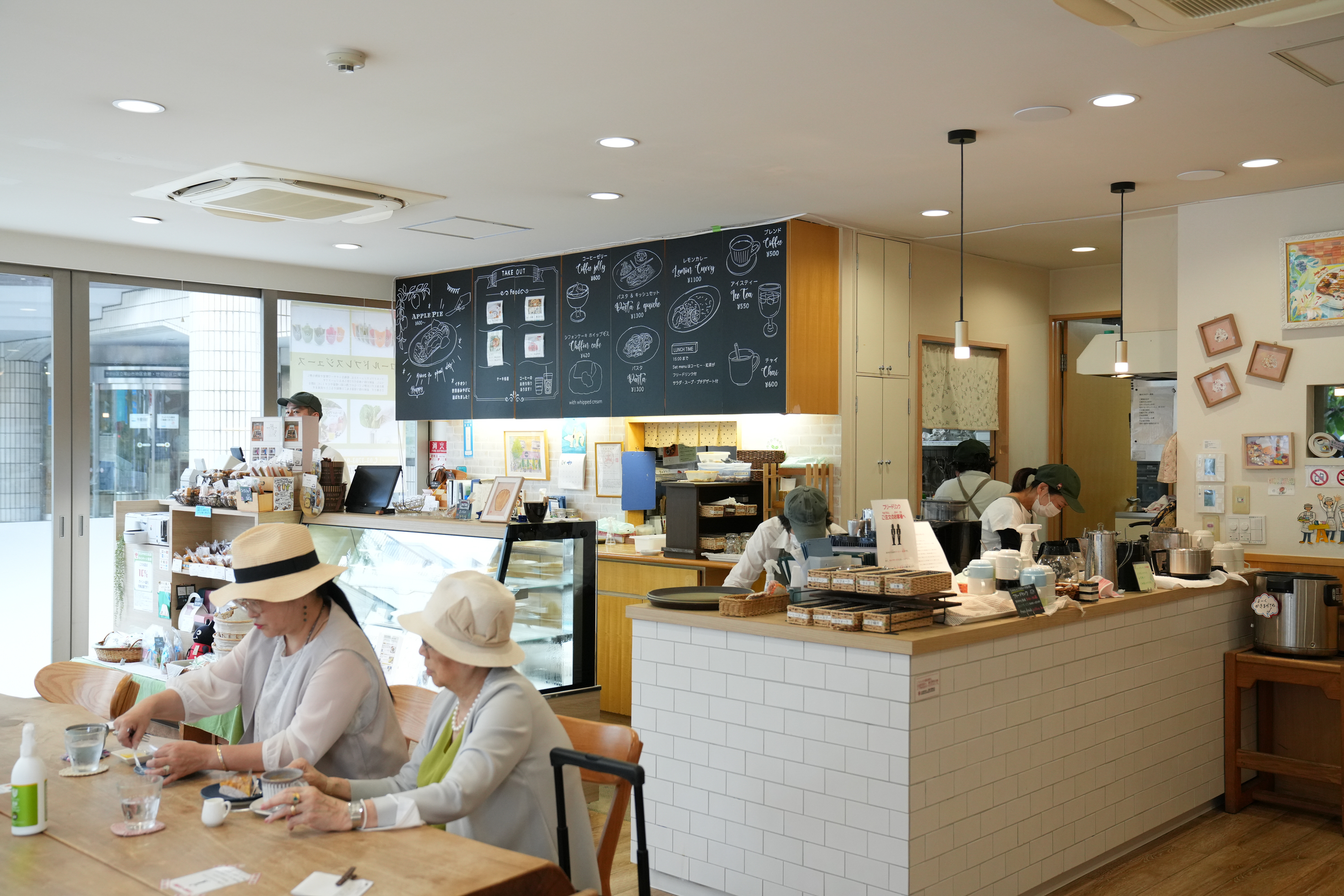 カウンター上の黒板には働く利用者さんが自発的に描いたという可愛いイラストメニュー、壁には地域の方の絵画の展示。一部食器は地域の方の手作り作品を使用。ワークショップや展示会も不定期で開催。利用者さんのみならず、地域の方の身近な表現空間としての店の新たな役割も定着。安心して働き続けられ、皆が住み続けられるサステナブルなまちづくりをとてもナチュラルに体現しています。