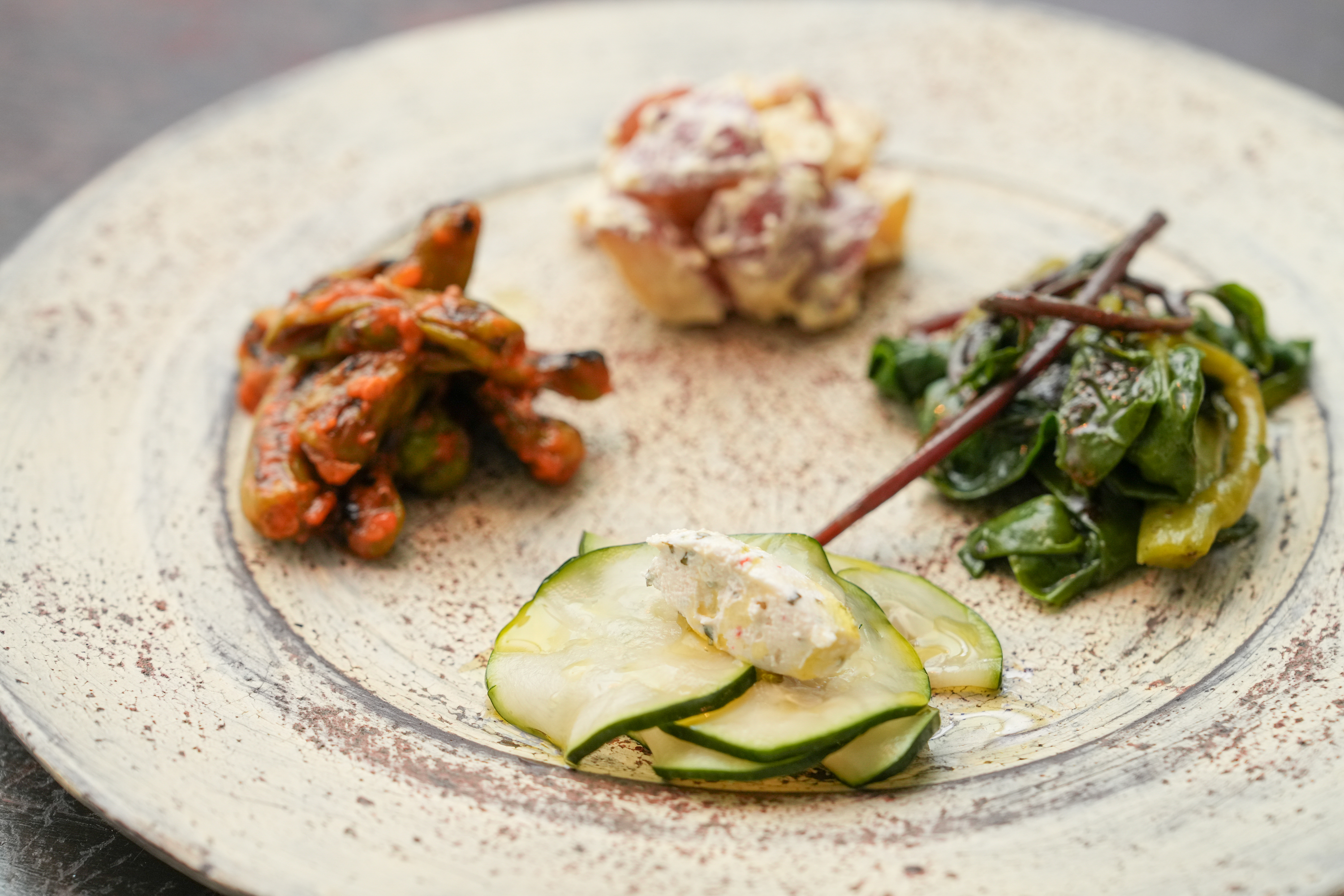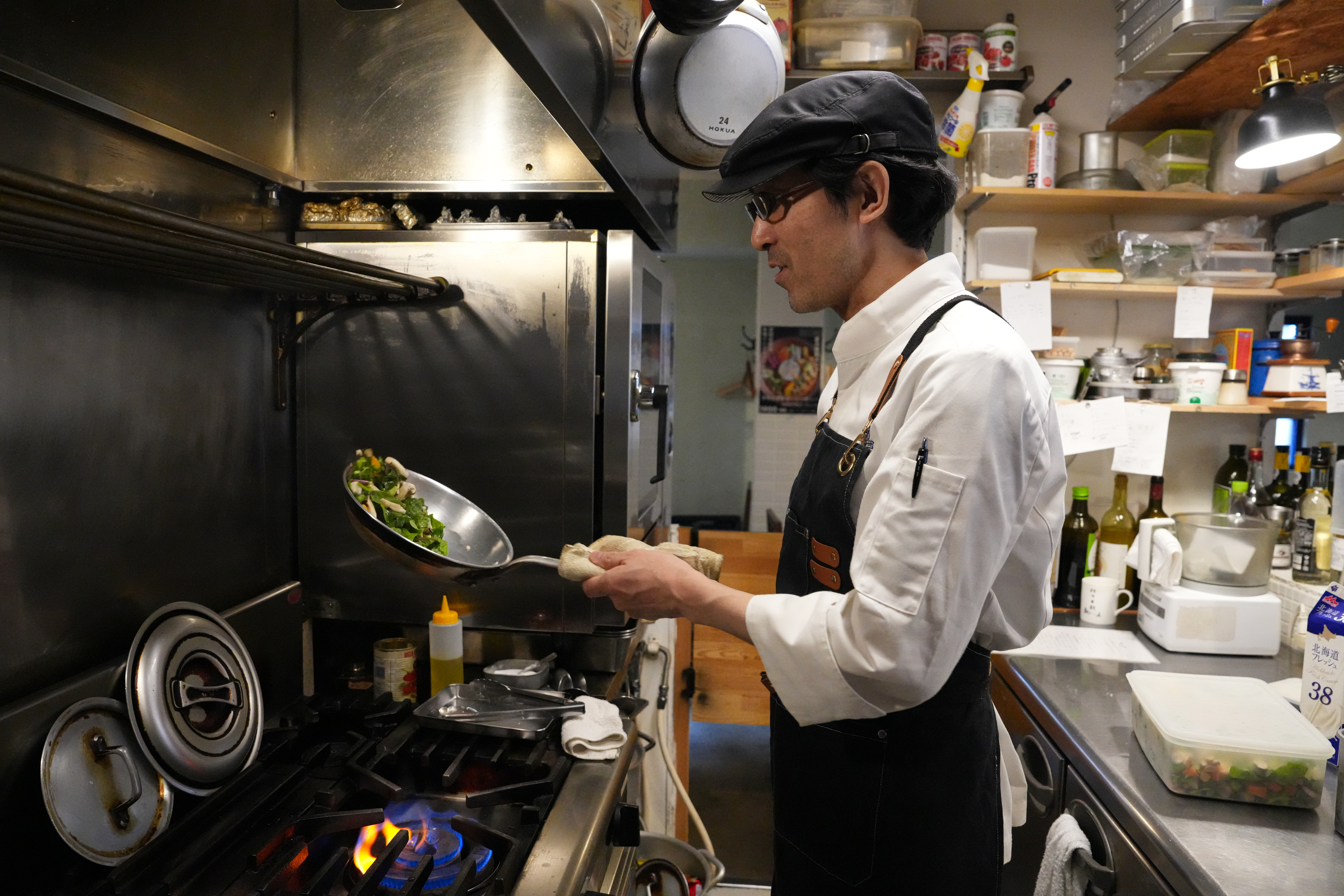料理人としてどこで誰が育ててくれたものかわかる、いい食材を扱っていきたいと仕入れ先をさがすなか、アースデーマーケットで静岡県の馬場修一郎農園の有機肥料無農薬野菜に出会い、そして地元の豊かな世田谷野菜の存在を知ります。それらの本来持つ美味しさを寺内さんが最大限に引き出していきます。