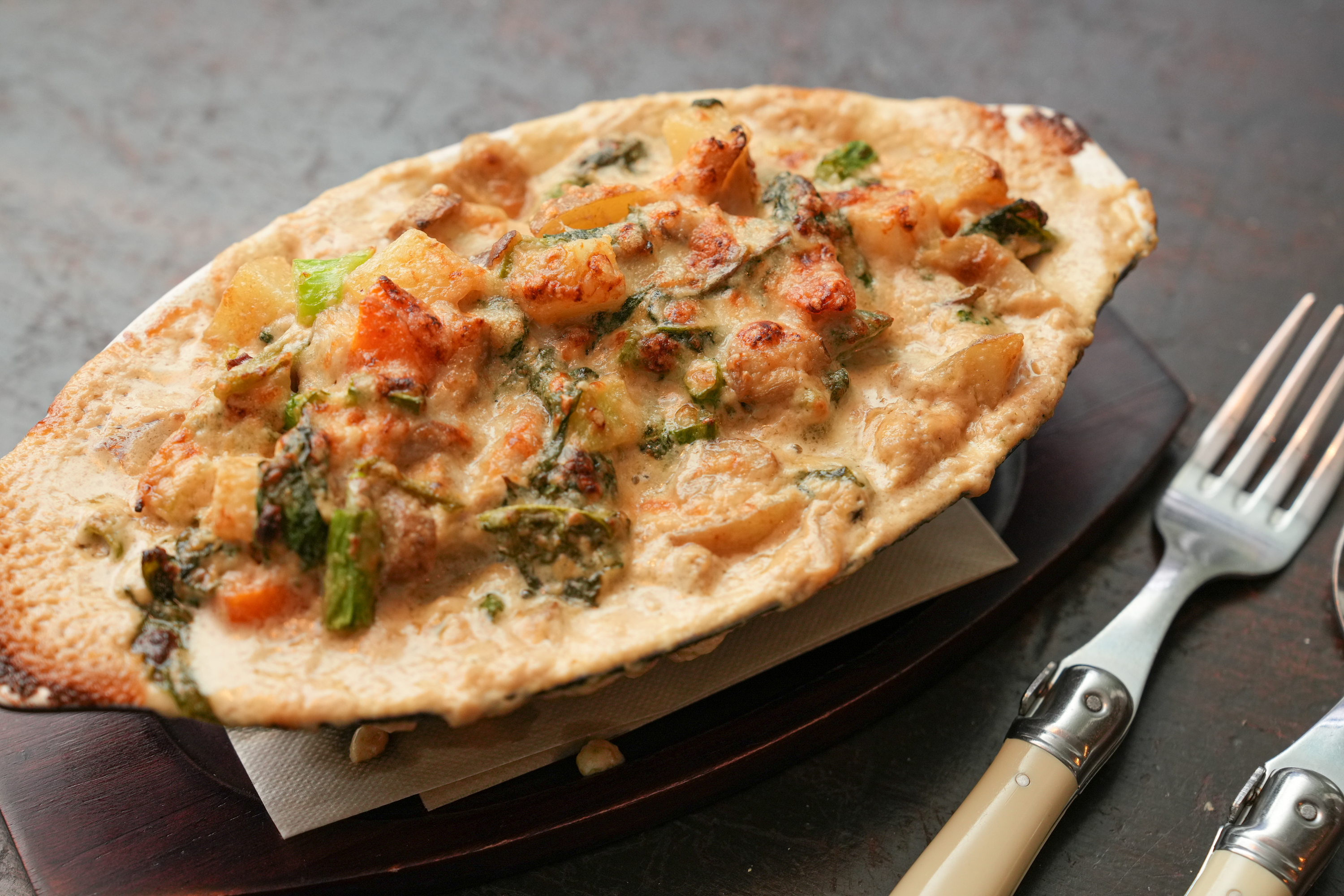 これでもかと旬の野菜がゴロゴロ詰め込まれたヨーグルトとマッシュルームソースの「季節野菜のグラタン」は開業以来の不動の人気メニュー。定番のほか、旬の野菜から次々とメニューを考案、前菜、メイン料理の付け合わせ、ソースとなってお披露目されます。そのラインナップに力を入れているナチュラルワインと融合する優しい味わいのものばかりです。